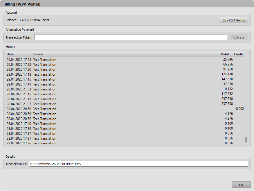 - Choose Help > Billing (VIVA Points) to call up the account balance in a VIVA program. Each transaction is assigned a unique Transaction ID, which can be used to trace the respective process exactly.