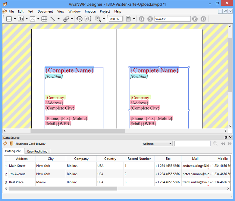 With the Database Publishing Edition “Creative Publishing”, short “CP”, you create design templates/forms with all the freedom of a layout program. In these templates, text and image objects as well as codes can be filled with content from the data source semi-automatically on the desktop or fully automatically via a server. “CP” templates/forms are what we call “static” templates, because the objects have a fixed position, height and width, just like in a layout program, and a template always describes a whole page. This output is very suitable for relatively simple designs like business papers, cards, posters etc..